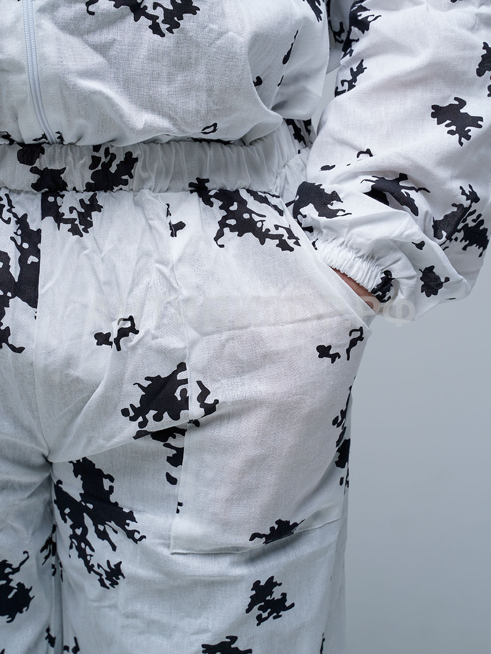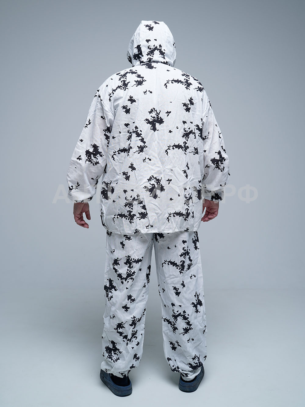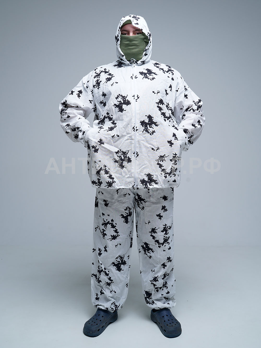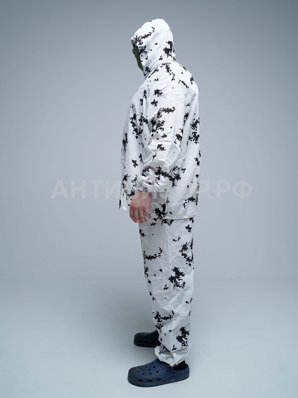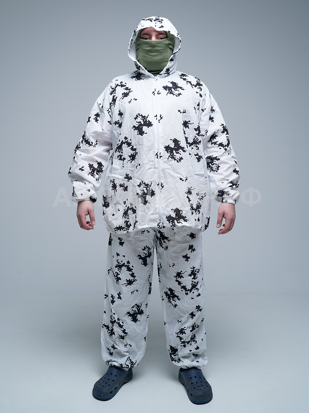 Назначения: Камуфлированный маскировочный халат предназначен для использования в зимнее время года на местности, покрытой снегом. Костюм изготовлены из хлопка Бязь. Ткань пропитана антибликом, она не бликует и не шуршит при ходьбе. Белая камуфлированная расцветка не заметна в полевых условиях. Масхалат одевается поверх любой одежды и не создаёт неудобств, не сковывает движений. В куртке предусмотрены прорези для попадания внутрь к тактической экипировке. Верх костюма на молнии. Объемный, несъёмный капюшон, который можно надеть на каску, шлем или шапку с регулировкой по овалу лица, манжеты на рукавах. Брюки с поясом на резинке и манжетами. Весь комплект в чехле занимает минимум места. Белый камуфляж костюма позволяет эффективно маскироваться среди снежного покровова, обеспечивая слияния с окружающей средой. Размер костюма рассчитан на верхнею одежду. *Данное изделия прошло испытания в реальной боевой обстановке.